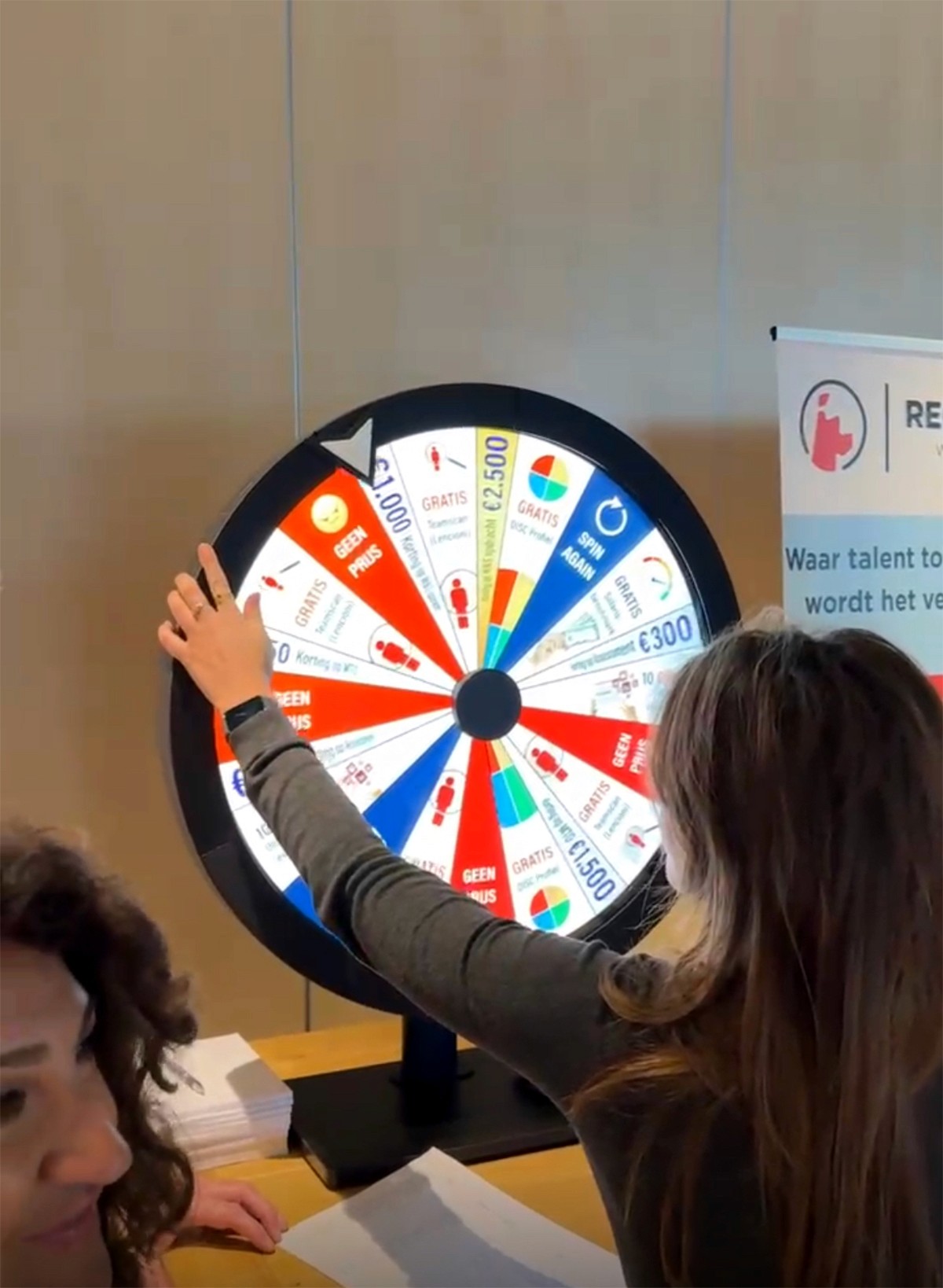 In de stand van H&S Adviesgroep en Regio Talent konden bezoekers meedoen aan winacties, zoals gratis Teamscans en kortingen tot €2.500 op producten zoals MTO’s en assessments. Het rad creëerde directe interactie: bezoekers draaiden enthousiast aan het rad, waarbij het enthousiasme en de betrokkenheid voelbaar waren.